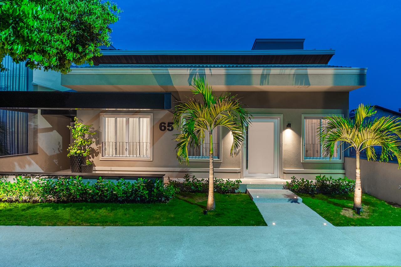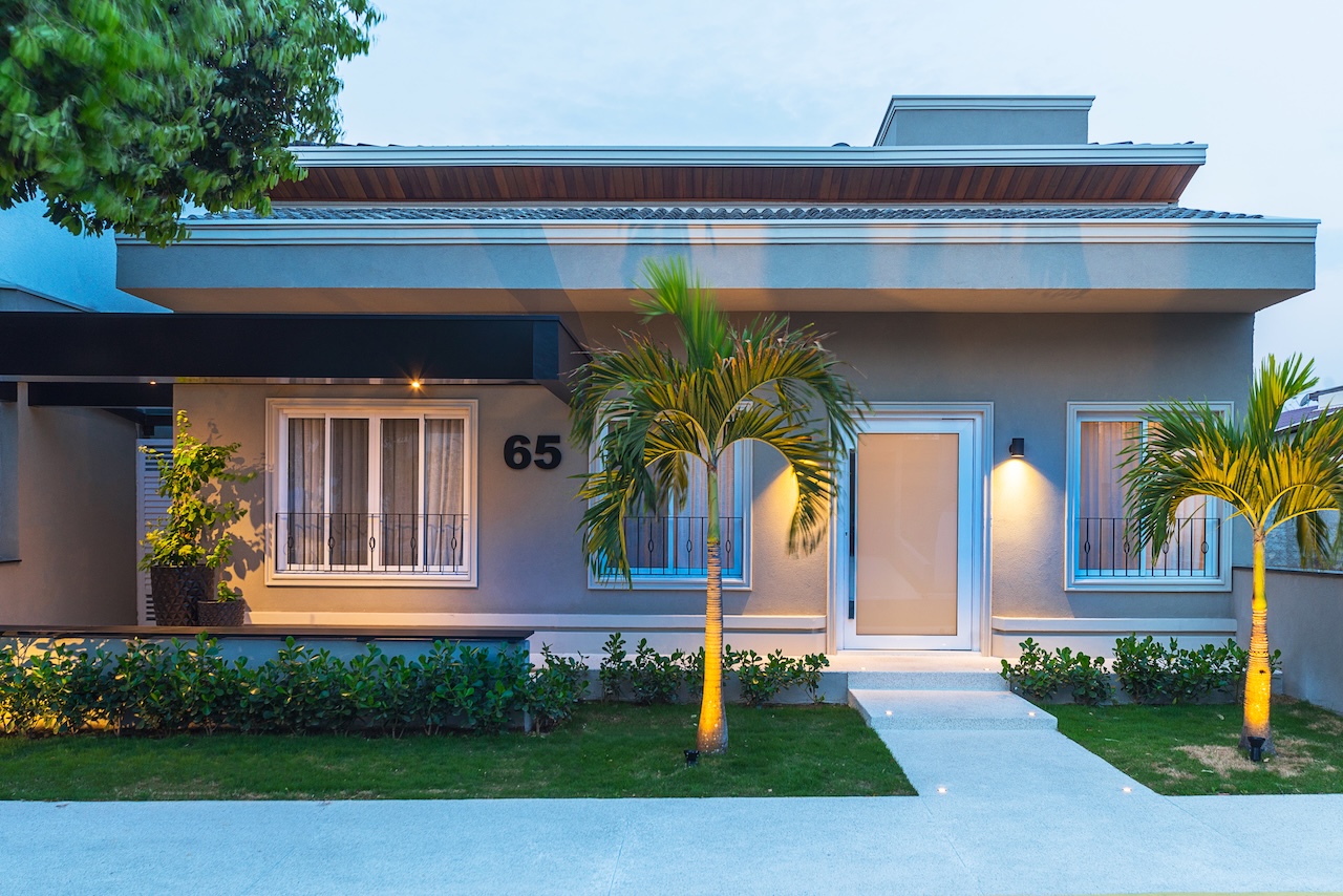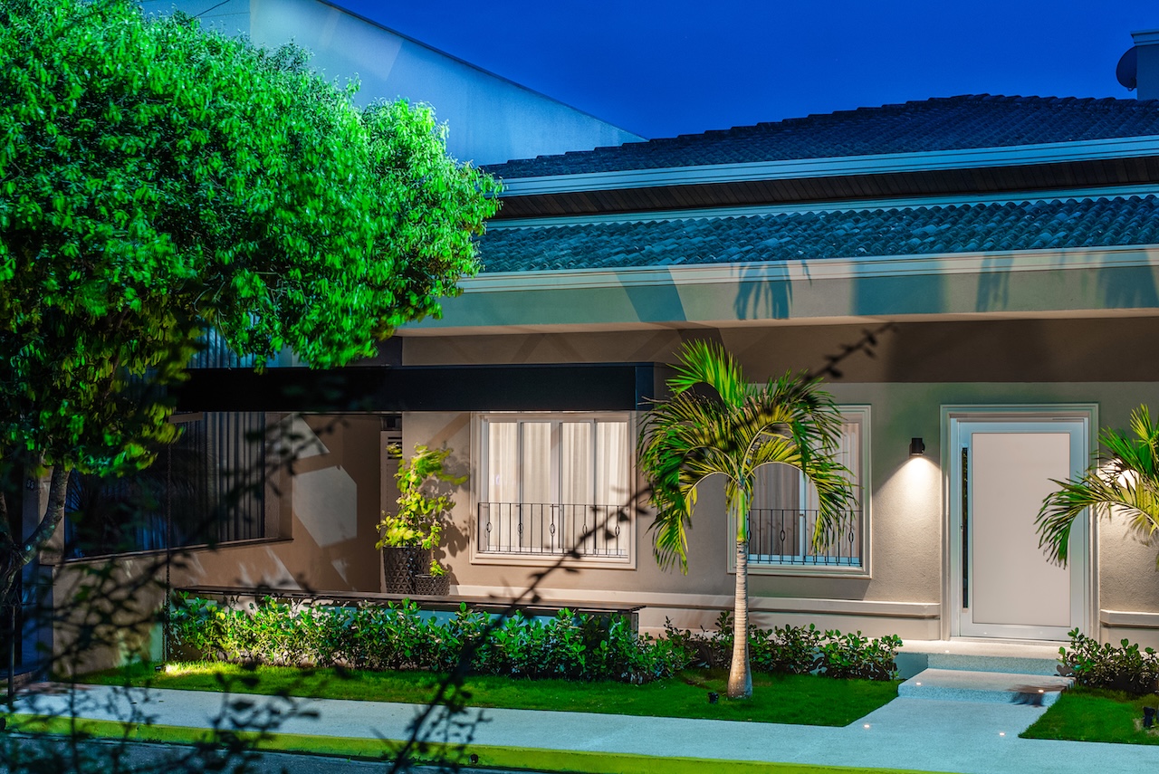 Nem só de interiores vive este escritório e nós podemos provar. Olha o antes e depois desta fachada! É a mesma casa (thais): com a remodelação interna, tivemos que pensar numa nova fachada, que refletisse o novo interior. Equalizamos as janelas, incorporamos molduras e rodapés, criamos um pergolado em alumínio, com um banco, onde a família pode aproveitar a convivência com os vizinhos, e atualizamos todo o paisagismo e a iluminação. O resultado não poderia ser melhor. Nós amamos!